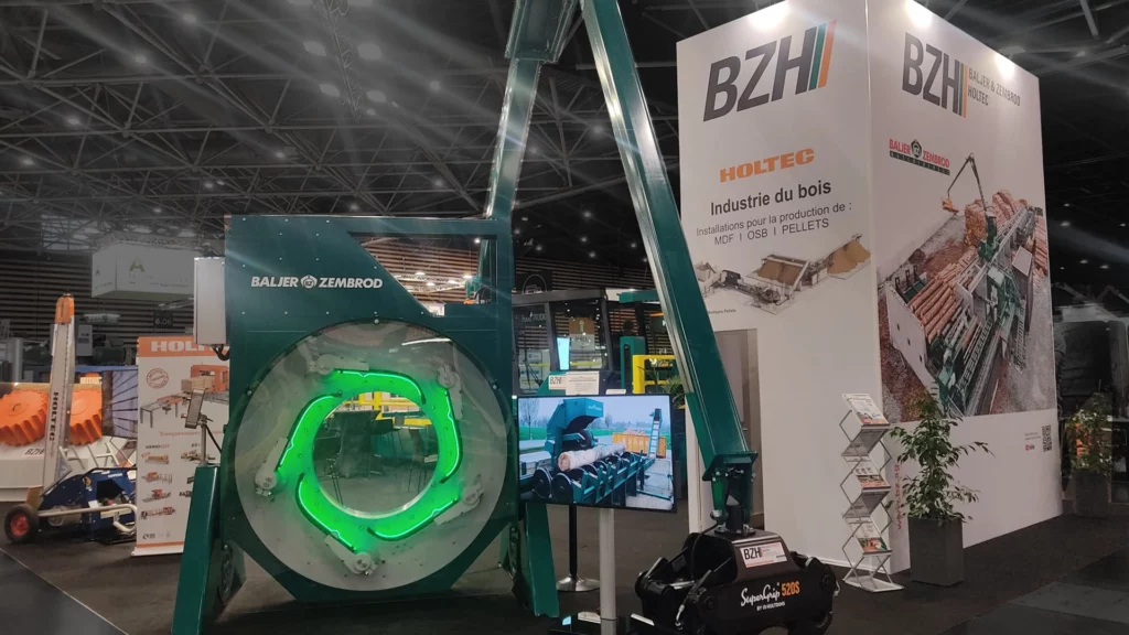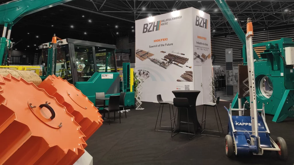 Un stand avec des machines XXL pour mettre en avant le savoir faire de la transformation du bois.